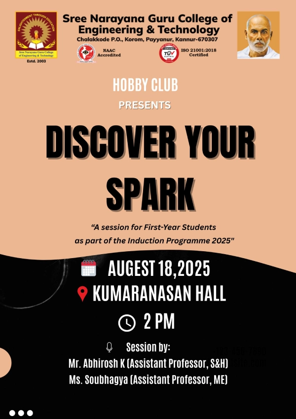 The Hobby Club of Sree Narayana Guru College of Engineering and Technology, Payyanur, organized an inspiring session titled “Discover Your Spark” on August 18, 2025, at Kumaranasan Hall, as part of the Induction Programme 2025 for first-year students.